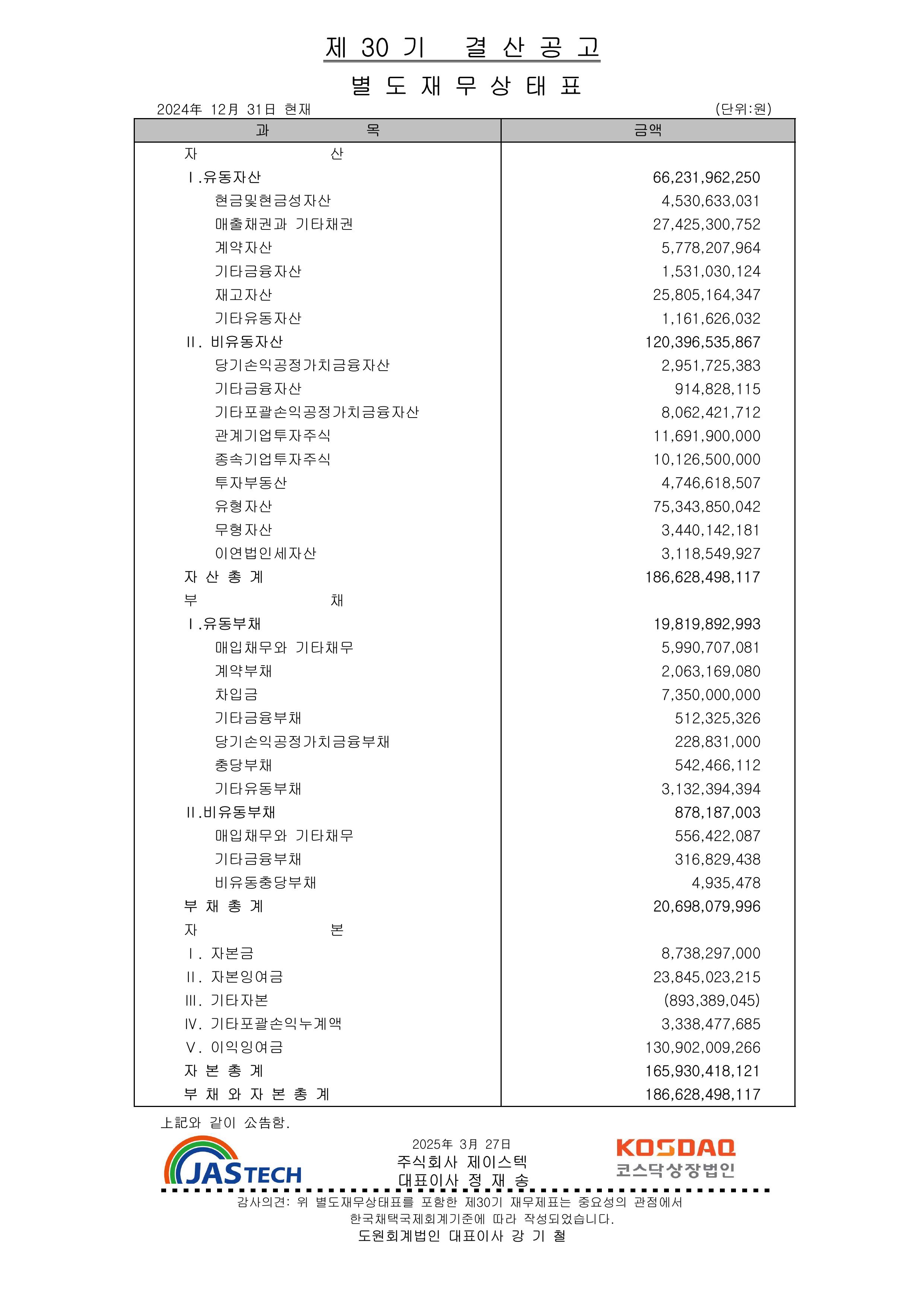 2024년(제30기) 결산공고(별도) 페이지 정보 작성자 최고관리자 댓글 0건 조회 2,003회 작성일 25-03-27 16:09 목록 답변 본문 이전글2025년(제31기) 감사보고서 26.03.18 다음글2024년(제30기) 결산공고(연결) 25.03.27 댓글 0 댓글목록 등록된 댓글이 없습니다.